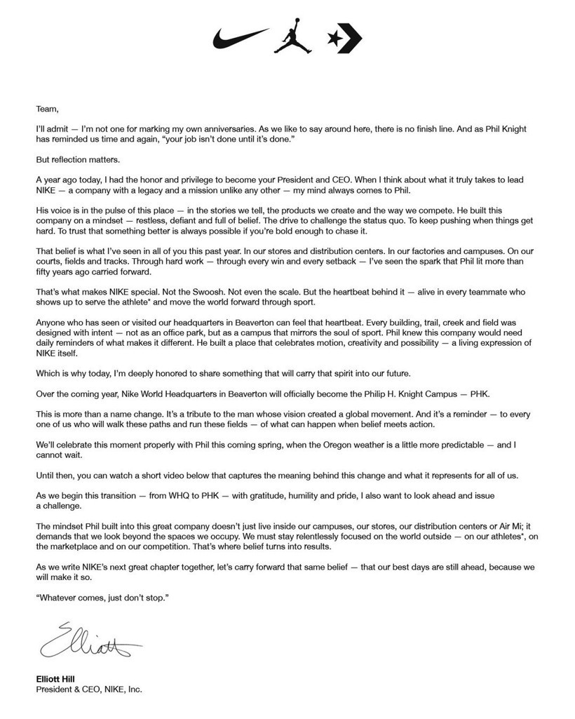 Nike Başkanı ve CEO’su Elliott Hill, çalışanlara gönderdiği açıklamada kararın yalnızca sembolik olmadığını belirterek, bunun “kurucunun zihniyetini” — yani merak, cesaret ve mümkün olana inanç ruhunu — her çalışana hatırlatmak amacı taşıdığını vurguladı.